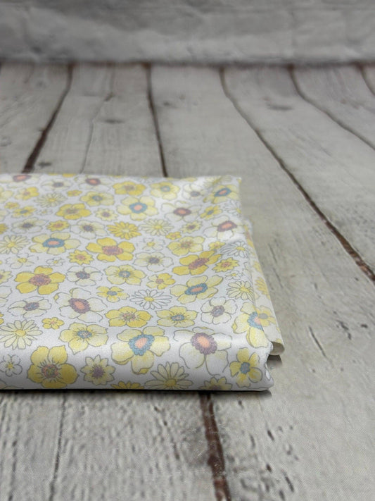 4 Way Stretch Tricot Print Spandex Fabric By The Yard Tricot Swim Wear Bikini Soft Pastel Small Ditsy Flower Foral Yellow Banana Daisy