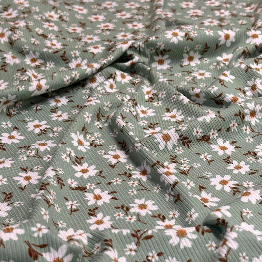 DBP 4x2 Rib Knit Mini Flower Double Brushed Polyester Spandex Vintage Ditsy Daisy Floral Monotone Sage Fabric By The Yard