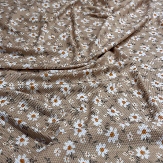 DBP 4x2 Rib Knit Mini Flower Double Brushed Polyester Spandex Vintage Ditsy Daisy Floral Khaki Fabric By The Yard