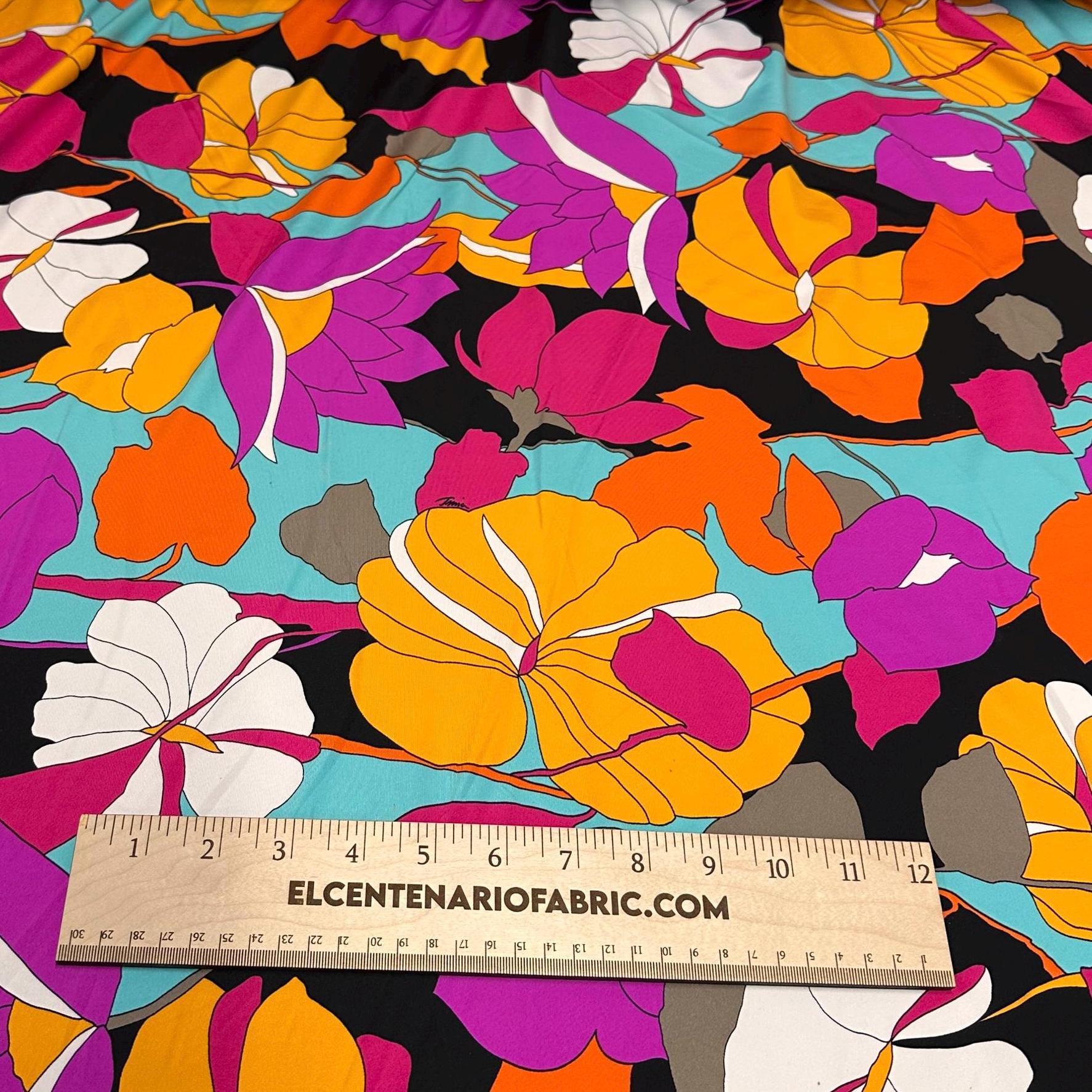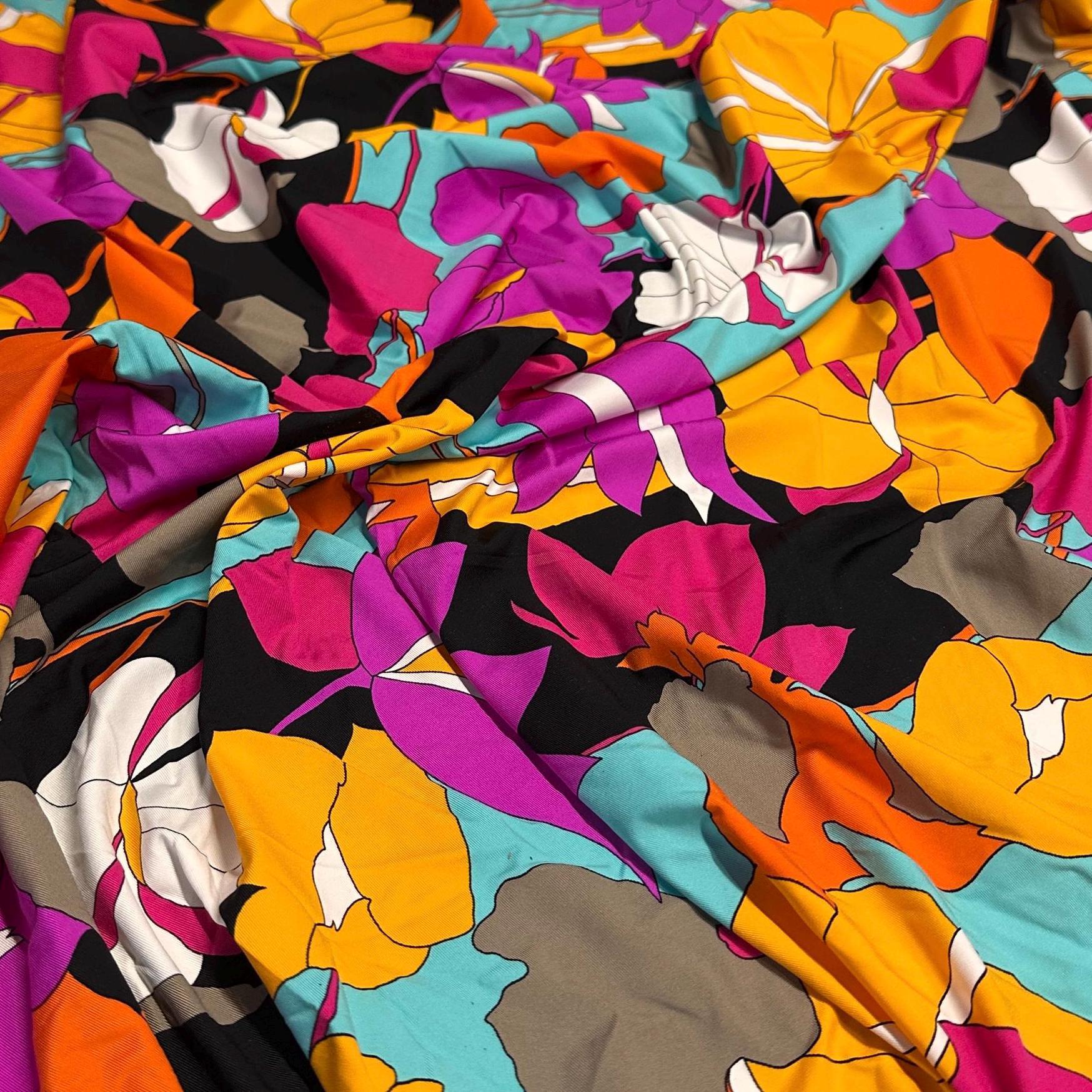4 Way Stretch Print Nylon Spandex Fabric By The Yard Tricot Swim Wear Bikini Active Wear Multicolor Floral Flower Leaf Teal Fuchsia Blossum