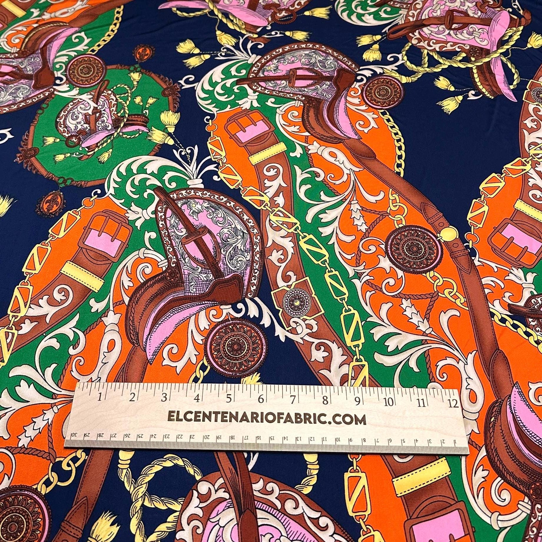 Venezia Poly Spandex Print Luxury Baroque-Inspired Print Elegant and Sophisticated Design Chains By The Yard Navy Orange